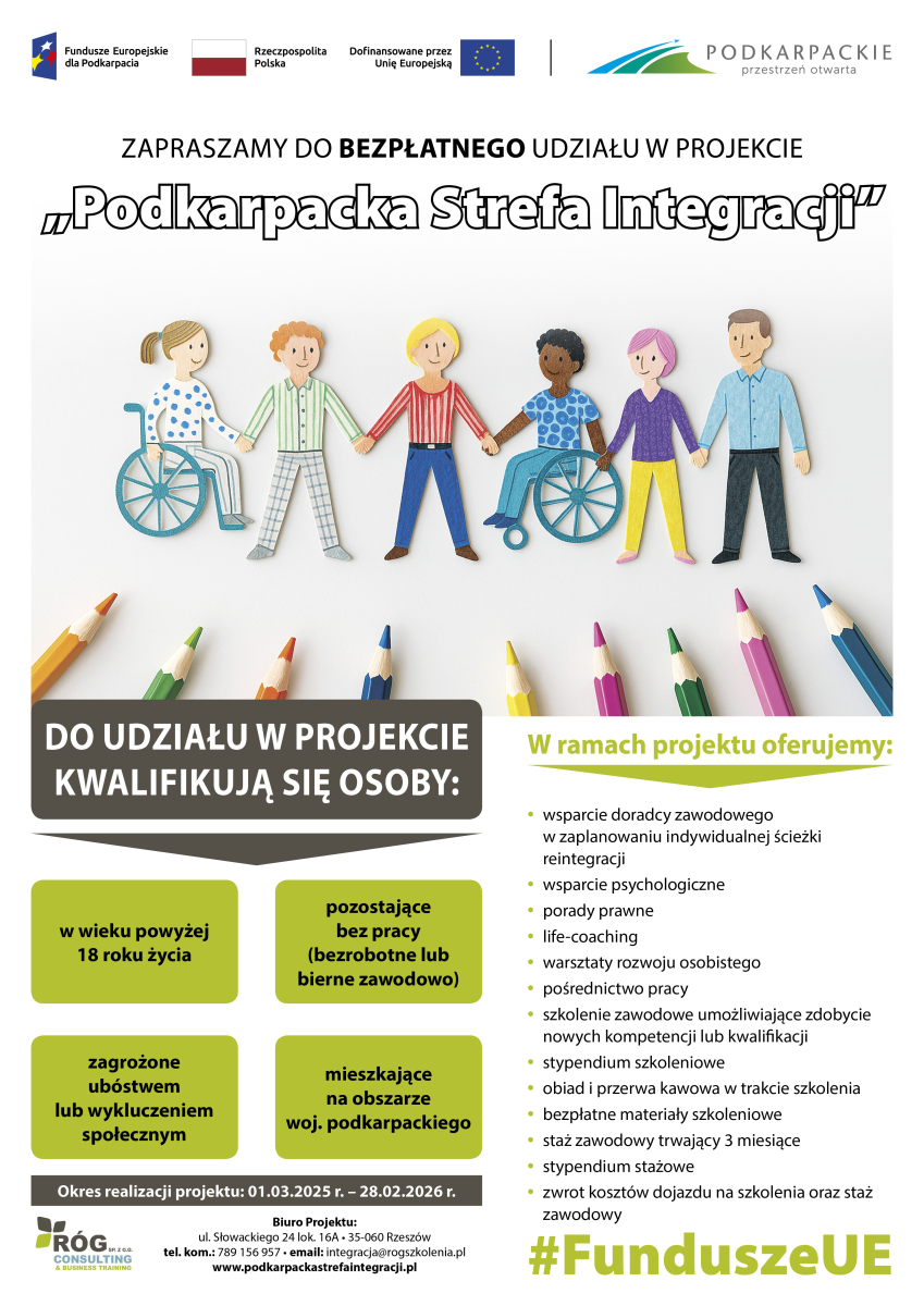 Pragniemy poinformować, że firma Róg Consulting & Business Training Sp. z o. o. realizuje projekt współfinansowany ze środków Unii Europejskiej pn. „Podkarpacka Strefa Integracji”.