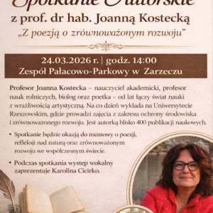 Serdecznie zapraszamy na spotkanie autorskie z prof. dr. hab. Joanną Kostecką pt. „Z poezją o zrównoważonym rozwoju” które odbędzie się w dniu 24.03.2026r. o godzinie 1400 w Zespole Pałacowo-Parkowym w Zarzeczu.